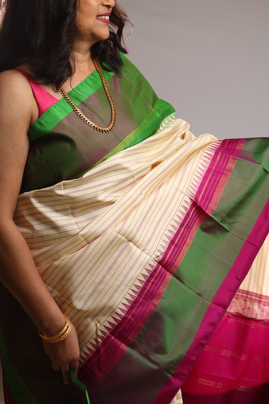 Ivory Striped Kanjivaram Silk with Broad Two-Tone Borders