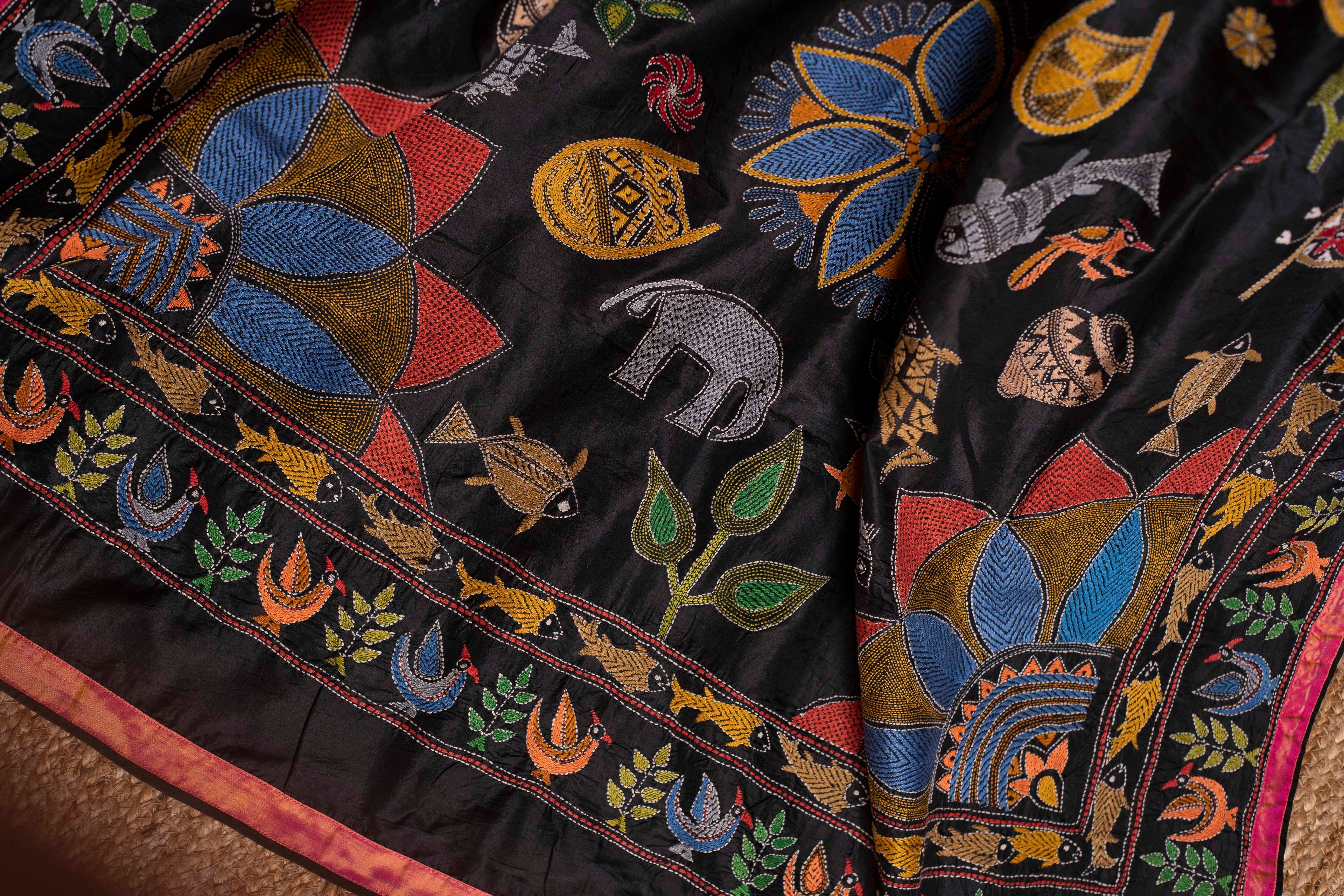 Exquisite mirror work and Kantha hand-embroidery makes this a one-of-a-kind piece from our Kantha collection: combining the folkloristic stitching of Kantha with the resplendence of hundreds of mirrors (aina) all across the body of the handwoven Bangalore silk saree.