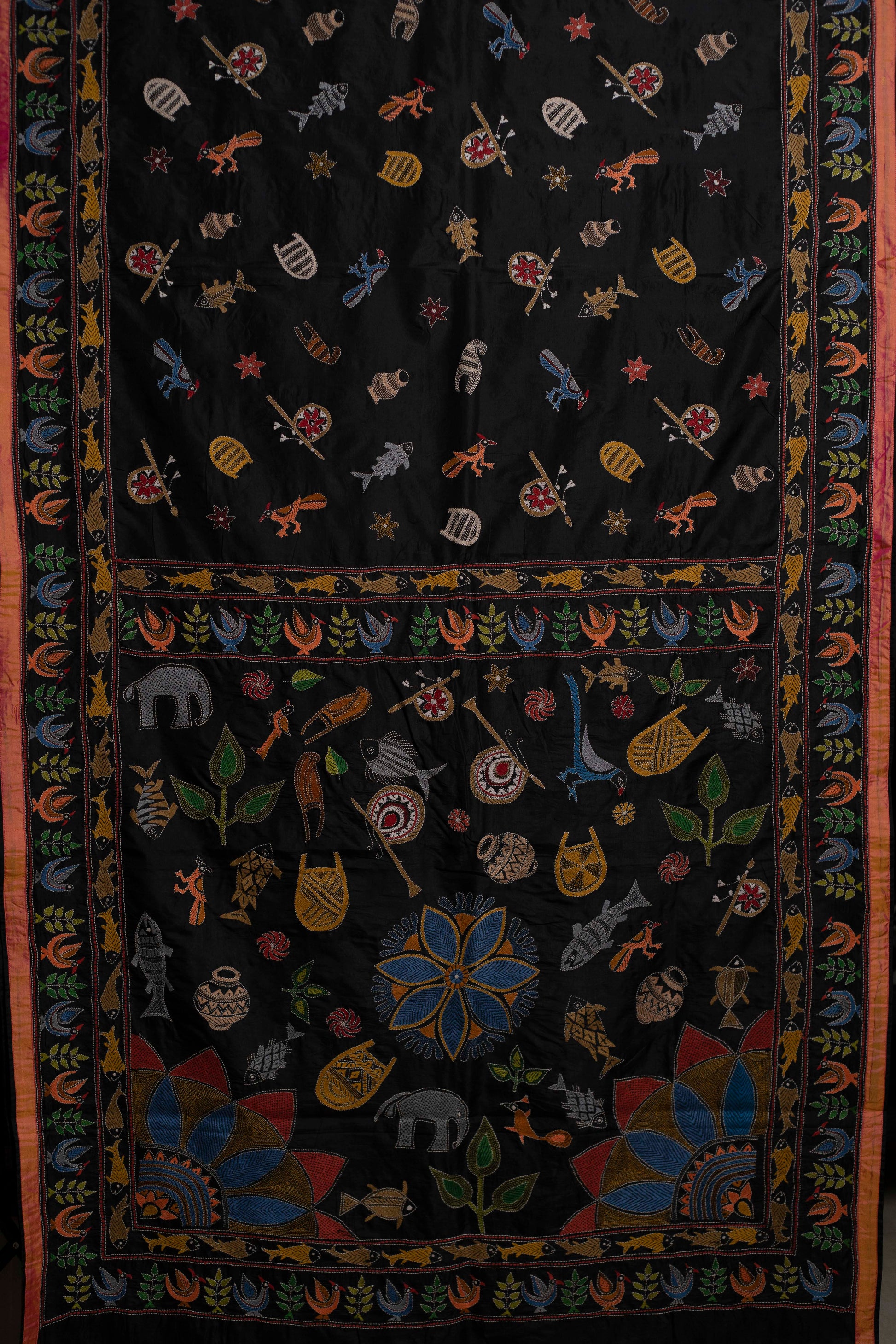 Fishes, ferns, flowers, haathpakha, dhaan kataa-r jhuri, birds, ghat, elephants, and solar lotuses frolick across the entirety of this black pure silk handwoven saree, paying homage to the ways of life of the rural communities of Bengal. Each motif in this saree draws inspiration from a real object, animal, plant, and place — signifying the myriad stories that surround the life of the artisan undertaking the hand-embroidery. The saree is completed by a silk selvedge in reddish orange.