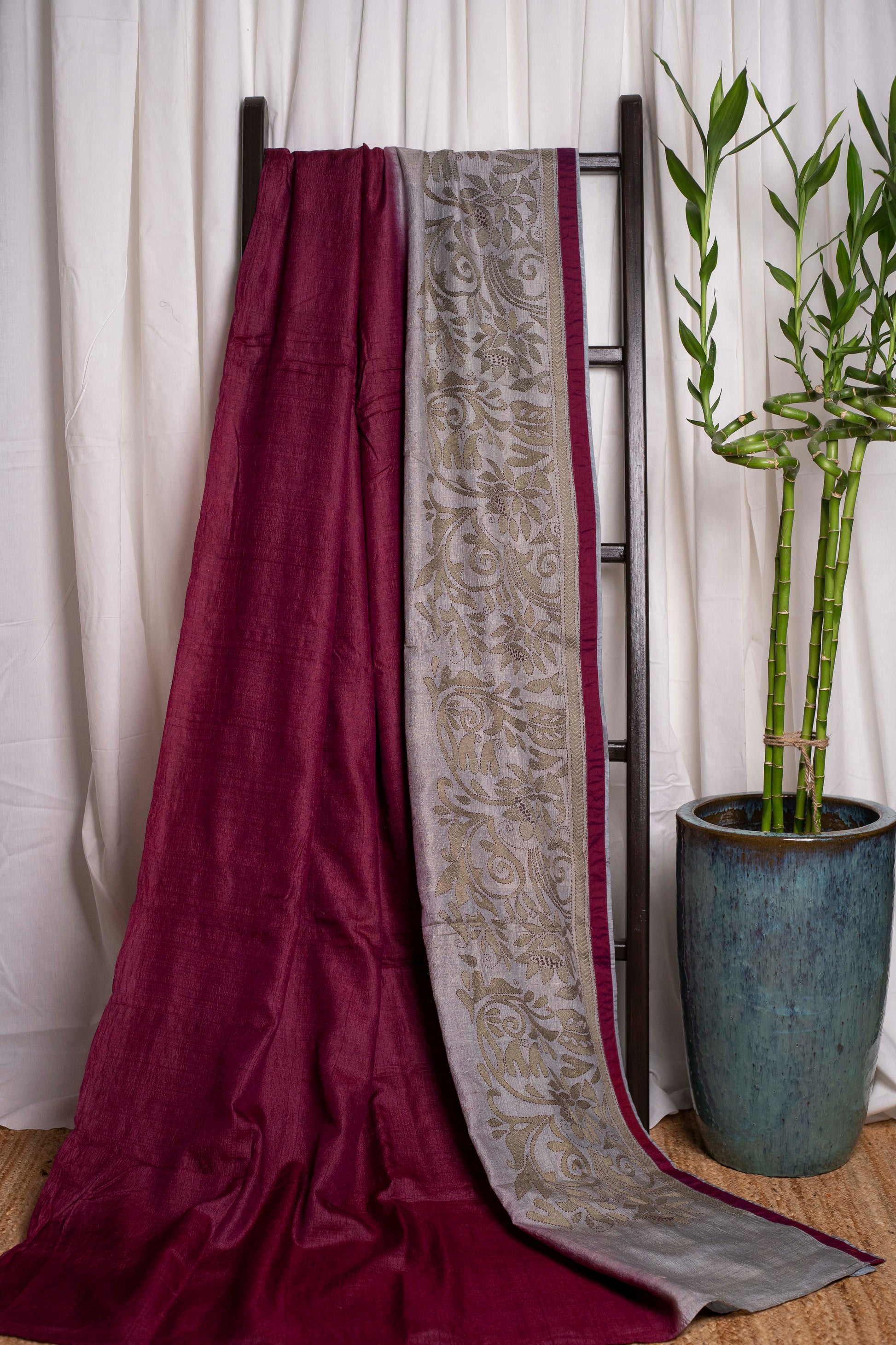 The essence of this kantha, anachronistically, reminds us of the "wine-dark sea" from Homer's Odyssey. The rippling waves of vines & flowers all-over hand-embroidered Kantha on the upper half of the weave in a subtle interplay of greenish grey-on-grey complement and enrich the wine-maroon silk of the lower half, girded by a broad grey border and wine-maroon silk selvedge. The sheen of pure, handwoven Bangalore silk is the perfect base for this subtle yet deeply sophisticated weave, a perfect fit for lovers of subtle yet iconic statements in their wardrobe.